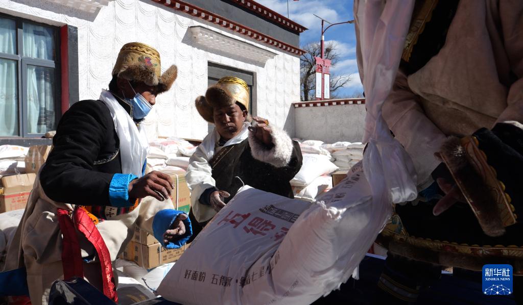 2月3日,努堆村2023年分紅大會(huì)現(xiàn)場(chǎng),村民們?cè)趯⒎旨t物資搬運(yùn)上車(chē)。新華社記者 格桑朗杰 攝