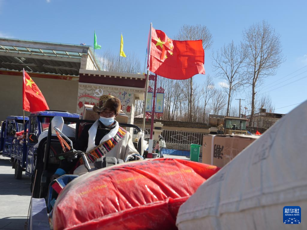 2月3日,努堆村2023年分紅大會(huì)現(xiàn)場(chǎng),村民用電動(dòng)三輪車(chē)將分紅物資運(yùn)回家中。新華社記者 洛卓嘉措 攝