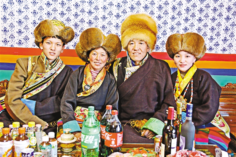 制作“切瑪”盒是藏歷新年一項(xiàng)歷史悠久的習(xí)俗,代表著群眾對(duì)五谷豐登的美好期盼。圖為瓊結(jié)縣唐布齊村群眾身著節(jié)日盛裝,端出精心制作的“切瑪”盒。