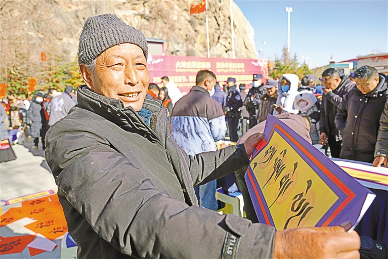 山南市文聯(lián)組織書法家走進(jìn)瓊結(jié)縣,開(kāi)展“我們的中國(guó)夢(mèng)——文化進(jìn)萬(wàn)家”活動(dòng)。圖為群眾展示獲贈(zèng)的藏文書法作品。