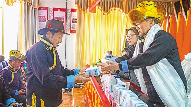 乃東區(qū)頗章鄉(xiāng)布仁村2023年集體經(jīng)濟(jì)分紅款達(dá)30余萬(wàn)元,惠及全村101戶群眾。圖為村民在領(lǐng)取分紅款。