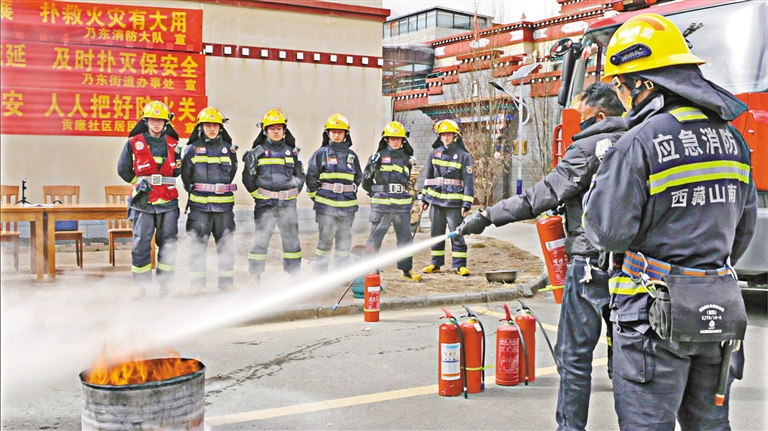 乃東區(qū)消防救援大隊(duì)來(lái)到乃東街道貢康社區(qū),組織駐村工作隊(duì)、網(wǎng)格員、群眾開(kāi)展消防應(yīng)急演練,進(jìn)一步提升群眾火災(zāi)防范意識(shí)和應(yīng)急處置能力。圖為消防員正在指導(dǎo)群眾進(jìn)行滅火實(shí)操。