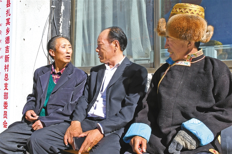 扎囊縣扎其鄉(xiāng)德吉新村,生活著藏族、漢族、土族等不同民族790余名群眾,該村先后榮獲縣級(jí)民族團(tuán)結(jié)進(jìn)步模范集體、山南市民族團(tuán)結(jié)進(jìn)步模范單位、自治區(qū)民族團(tuán)結(jié)進(jìn)步模范村(居)等稱號(hào),是山南市遠(yuǎn)近聞名的“團(tuán)結(jié)村”?!D為在德吉新村村委會(huì)大院內(nèi),祖籍青海,身著藏裝的村民張積成(右一),與同村不同民族的群眾一起交談。記者 丹增平措 攝