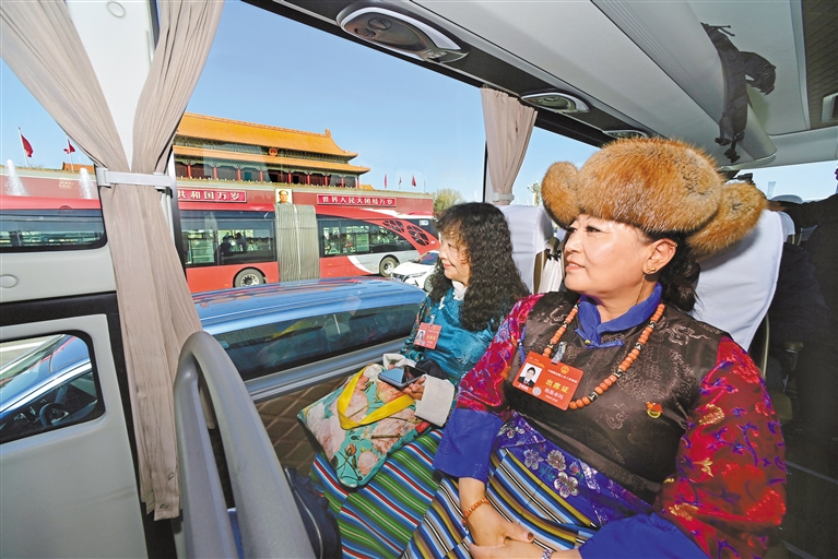 圖為人大代表們?cè)谇巴v地的途中經(jīng)過(guò)天安門(mén)。記者 旦增西旦 攝
