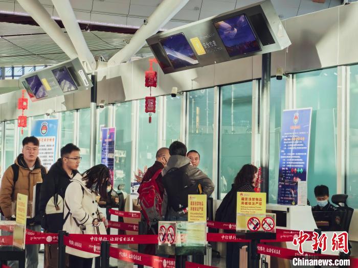 圖為拉薩貢嘎國際機(jī)場內(nèi),旅客排隊(duì)等待安檢。姚文杰 攝