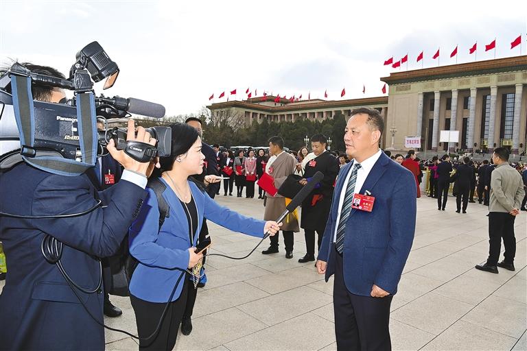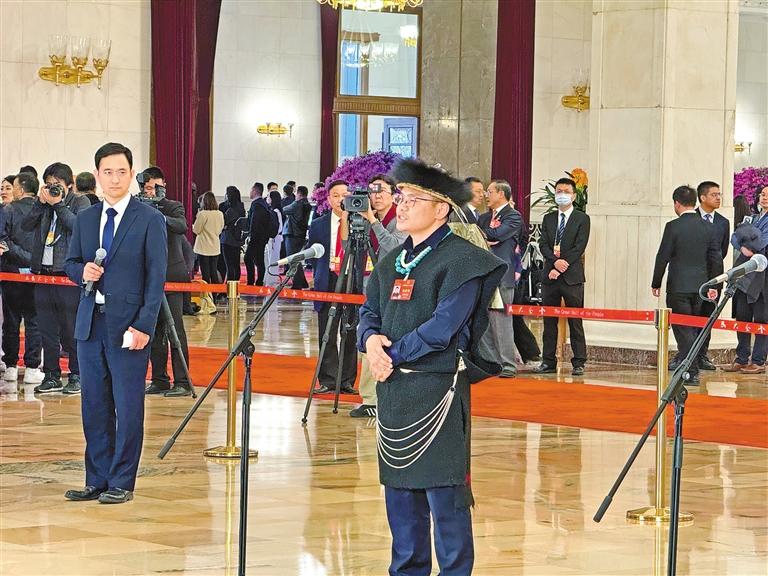 圖為西藏全國(guó)人大代表扎西江村在“代表通道”回答記者提問(wèn)。