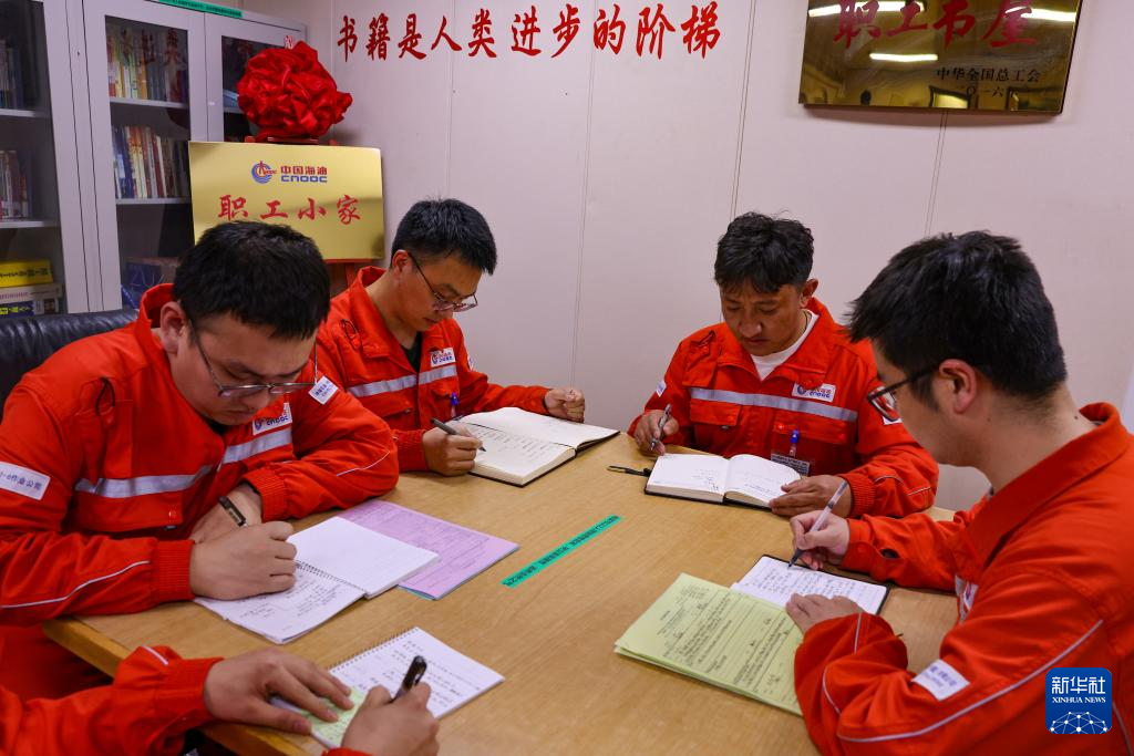 在秦皇島32-6油田“渤海世紀號”(FPSO)16萬噸級浮式生產(chǎn)儲油裝置上,強巴(右二)輪班結(jié)束后參加班組總結(jié)會(3月7日攝)。新華社記者 黃耀漫 攝