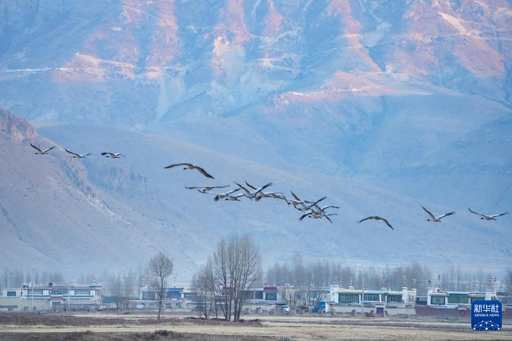 這是在林周縣虎頭山水庫附近村莊拍攝的黑頸鶴(3月17日攝)。新華社記者 晉美多吉 攝