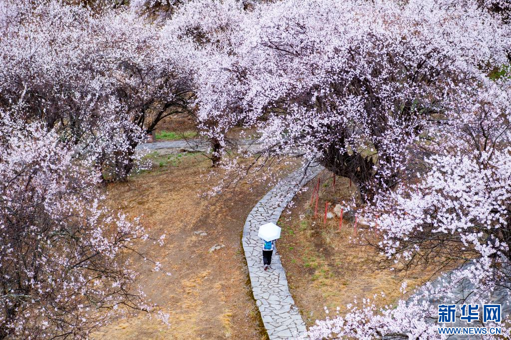 4月3日,林芝市巴宜區(qū)嘎拉村盛開的桃花(無人機(jī)照片)。新華網(wǎng) 旦增努布 攝
