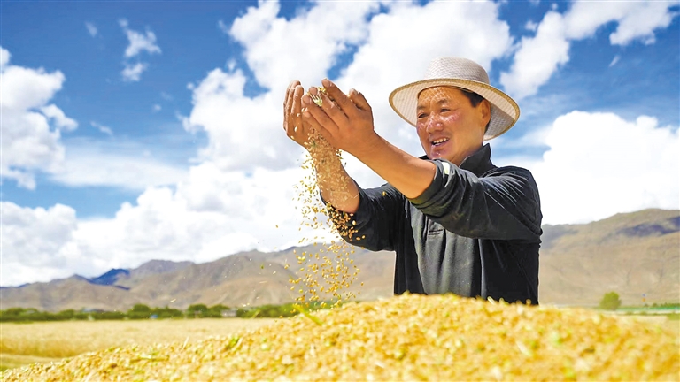 日喀則市白朗縣嘎東鎮(zhèn)馬義村村委會(huì)副主任普瓊手捧豐收的麥粒,高興地說:“高標(biāo)準(zhǔn)農(nóng)田建設(shè)為我們節(jié)省了大量的人力,實(shí)現(xiàn)了農(nóng)業(yè)機(jī)械化,讓未來(lái)的生活充滿了希望?!?/p>