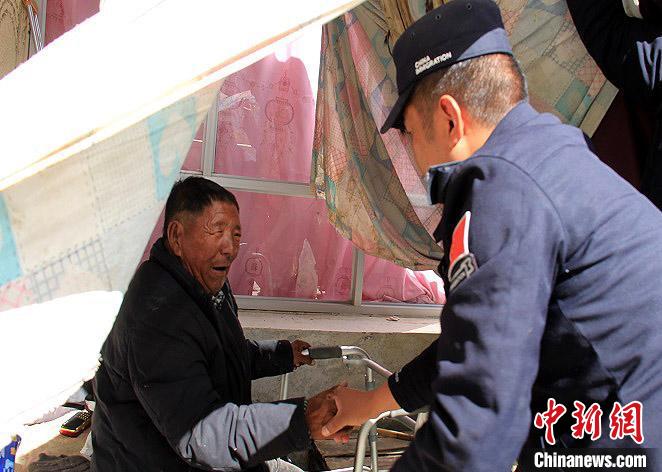 圖為桑珠老人為上門服務(wù)的民警連聲道謝。次仁頓珠 攝