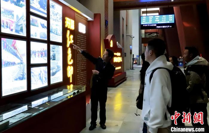 拉薩車站客運(yùn)運(yùn)轉(zhuǎn)車間主任候占元帶領(lǐng)候車旅客參觀車站的愛(ài)國(guó)主義教育基地文化長(zhǎng)廊。旅客們?cè)谶@里聆聽(tīng)了青藏鐵路發(fā)展史、青藏鐵路人的奮斗故事。