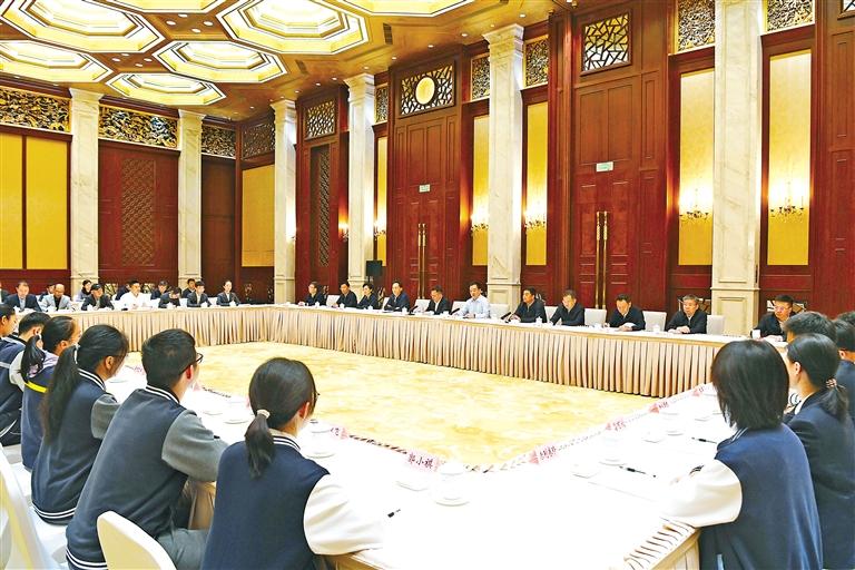 5月10日至11日,西藏自治區(qū)黨政代表團(tuán)赴上海學(xué)習(xí)考察。這是王君正看望西藏班師生、西藏籍高校畢業(yè)生就業(yè)代表,聽取他們在上海學(xué)習(xí)、工作情況。 記者 李洲 攝