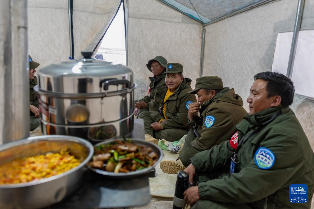 野生動物專業(yè)管護隊員們在宿營的帳篷中準(zhǔn)備吃飯(5月7日攝)。新華社記者 姜帆 攝