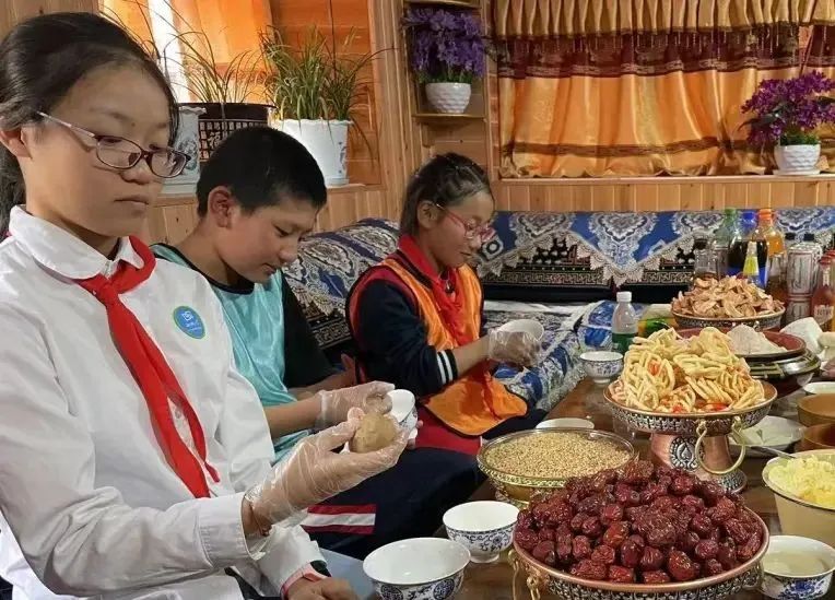 在“藏家”融情交流中,各地少先隊員在農(nóng)家一起學(xué)習(xí)制作西藏傳統(tǒng)美食糌粑、卡塞等,一個個極具創(chuàng)意造型的“小卡塞”,精致巧妙,隊員們共學(xué)、共樂、共享,體悟藏家民族風(fēng)俗,沉浸在歡樂的氛圍中?!皡⒓哟舜沃黝}隊會交流活動我非常開心,深度體驗了‘藏家’民俗,看到祖國邊疆鄉(xiāng)村的小康生活,豐富的活動讓我增強了對中華民族優(yōu)秀文化的認(rèn)同感和自豪感,我要繼續(xù)爭做小石榴籽,切實鑄牢中華民族共同體意識”來自重慶市璧山區(qū)劍山實驗小學(xué)五(3)中隊隊員李思穎表示。