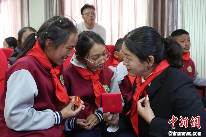 圖為單增卓嘎正在為學(xué)生們展示和講解莊嚴的法徽。倫珠澤仁攝