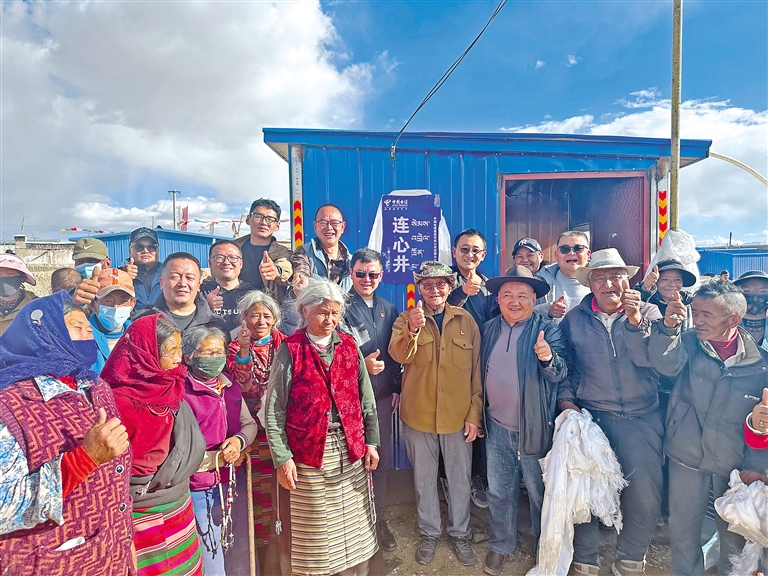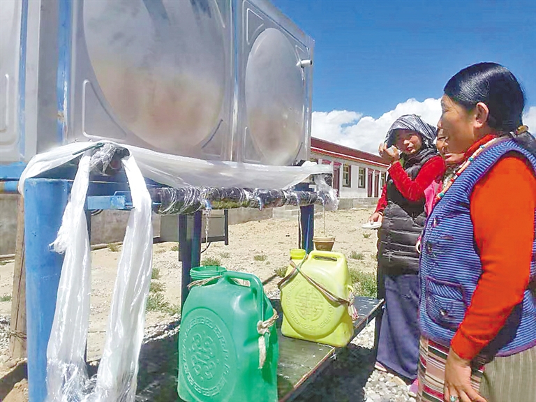 霍爾巴鄉(xiāng)群眾在中國電信西藏公司投資修建的扶貧項目機井取水。