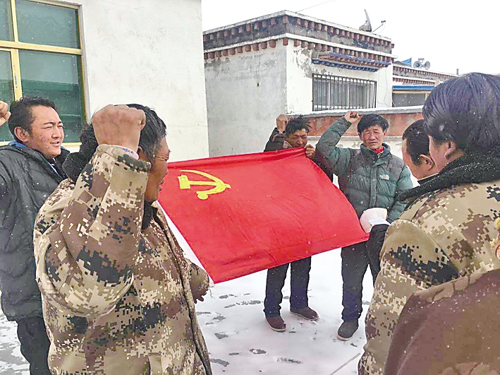 中國電信西藏公司駐霍爾巴鄉(xiāng)駐村工作隊與聯系點黨員干部重溫入黨宣誓。