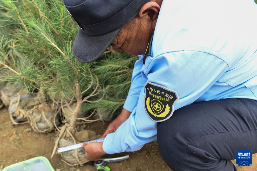 6月3日,在拉薩南北山綠化工程2024年度鞏固提升(貢嘎機場周邊山體)工程項目上,林業(yè)檢疫執(zhí)法工作人員在檢查樹苗根部土球是否達(dá)標(biāo)。新華社記者 晉美多吉 攝