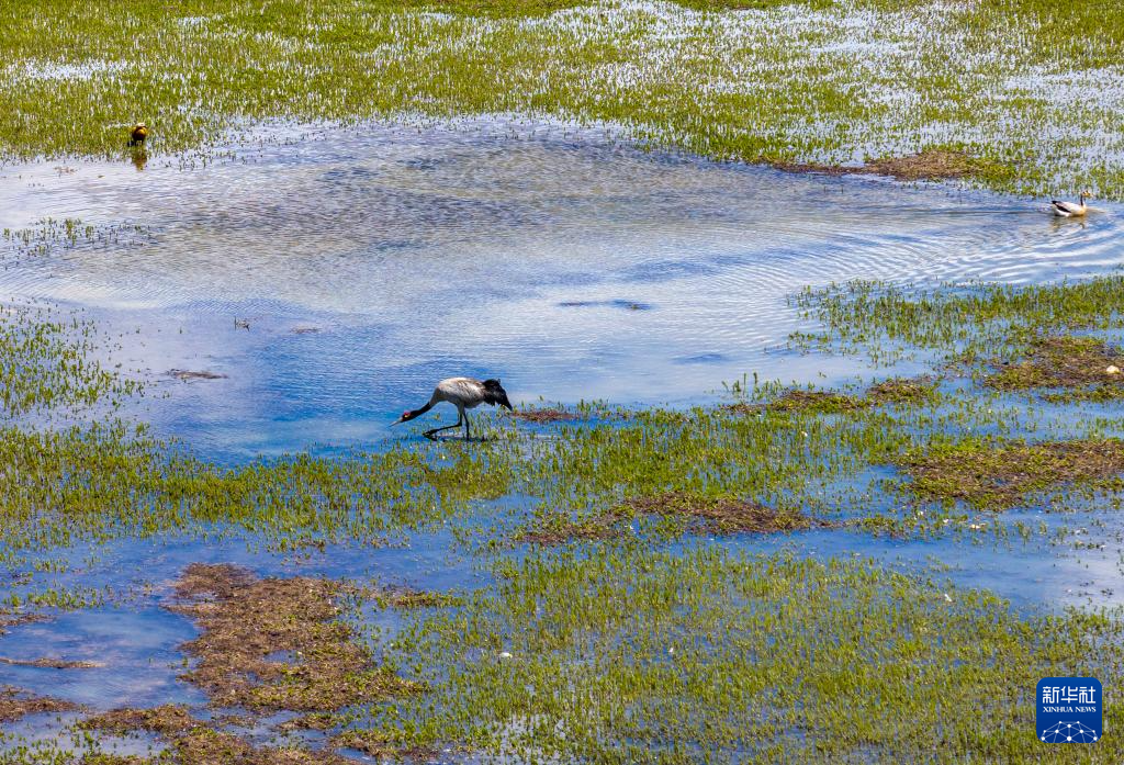 黑頸鶴在濕地覓食(6月8日攝,無(wú)人機(jī)照片)。新華社記者 姜帆 攝