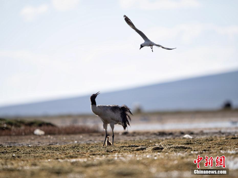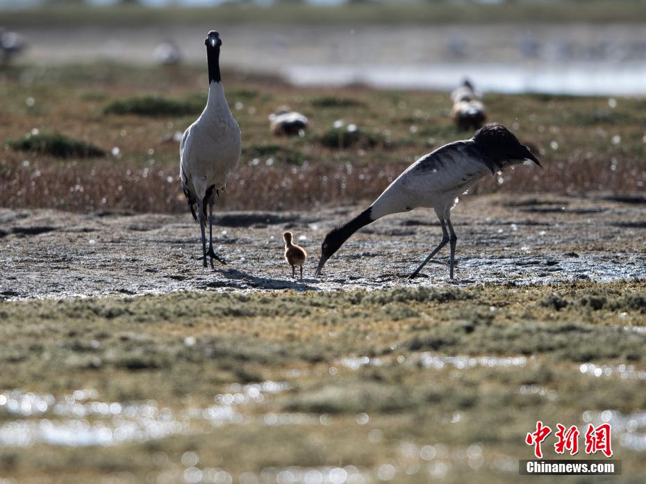 圖為黑頸鶴幼崽在父母的引導(dǎo)下在濕地里棲息、覓食。貢嘎來松 攝