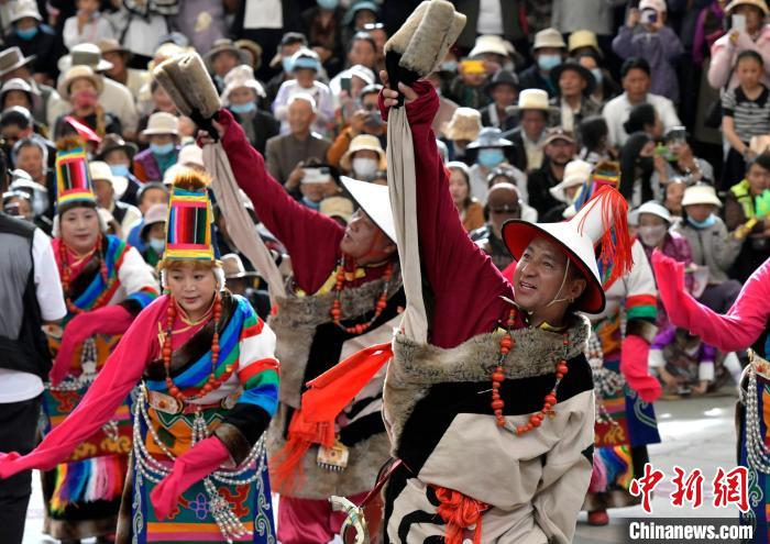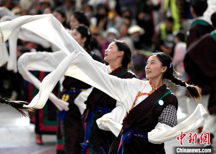 6月14日,第二屆拉薩鍋莊舞大賽決賽在布達(dá)拉宮腳下的宗角祿康公園舉辦,共有12支隊伍參賽。圖為鍋莊舞大賽決賽現(xiàn)場。中新社記者 李林 攝