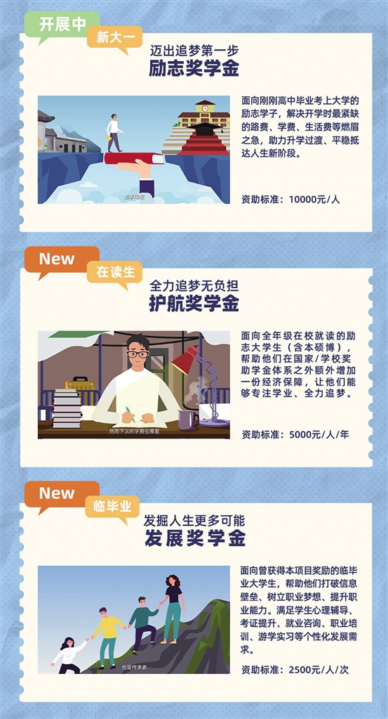 今年高考分?jǐn)?shù)揭曉在即,項(xiàng)目升級(jí)為“夢想+”大學(xué)生助力計(jì)劃,除繼續(xù)重點(diǎn)獎(jiǎng)勵(lì)剛考上大學(xué)的勵(lì)志新生每人1萬元“勵(lì)志獎(jiǎng)學(xué)金”外,之后學(xué)生在本碩博直到臨畢業(yè)期間,如有困難仍可繼續(xù)申請(qǐng)“護(hù)航獎(jiǎng)學(xué)金”(5000元/人/年)和“發(fā)展獎(jiǎng)學(xué)金”(2500元/人/次)。為了能夠讓更多學(xué)子獲得獎(jiǎng)學(xué)金,今年項(xiàng)目繼續(xù)聯(lián)合杭州嘉互助學(xué)基金會(huì)開通公募渠道,公募款將100%用于獎(jiǎng)勵(lì)勵(lì)志學(xué)子。