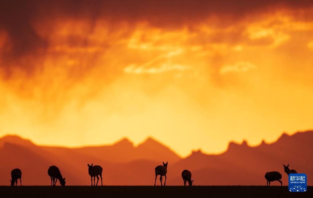 夕陽(yáng)下,母藏羚羊在魯確塘草原上活動(dòng)(6月16日攝)。新華社記者 晉美多吉 攝