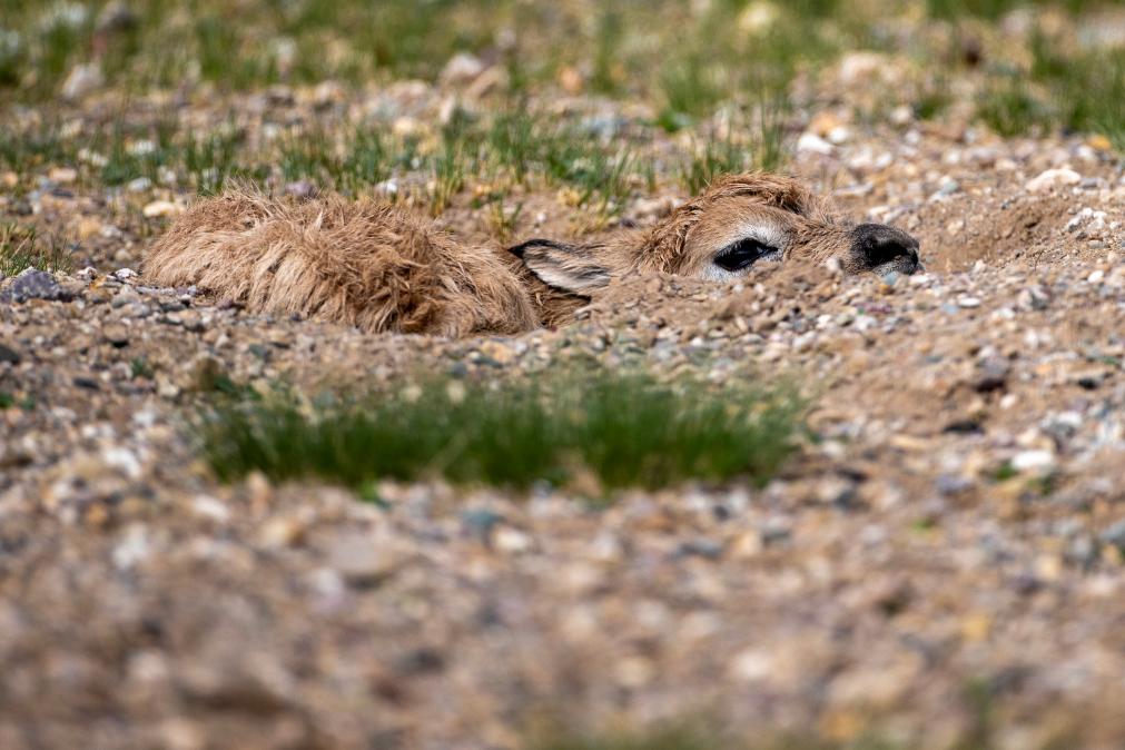 經(jīng)過6個月懷胎,它順利誕下一只黑褐色的小生命。小藏羚羊的臍帶剛剛斷開,無法站穩(wěn),母藏羚羊迅速跑開近百米,直到小藏羚羊身上沾滿砂石,搖搖晃晃地支撐起后腿,用黑色的鼻子輕嗅草地,它才回來舔舐孩子的身體。
