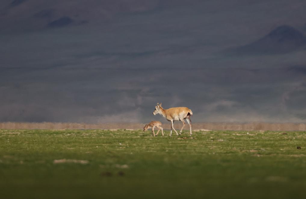 魯確塘草原上,藏羚羊護著剛出生的孩子(6月17日攝)。新華社記者 晉美多吉 攝