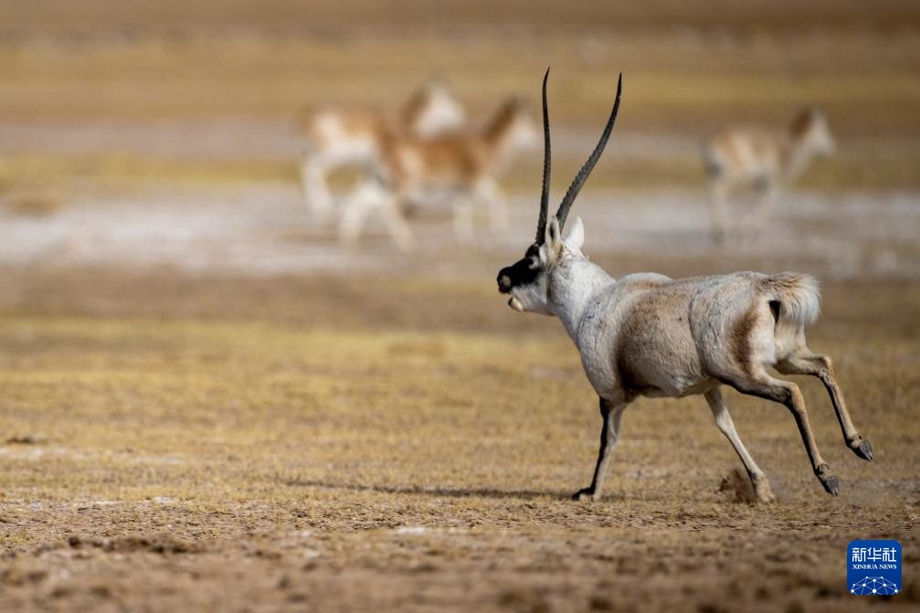 在羌塘國家級自然保護區(qū),一只雄性藏羚羊奔向雌性(2023年12月16日攝)。新華社記者 姜帆 攝