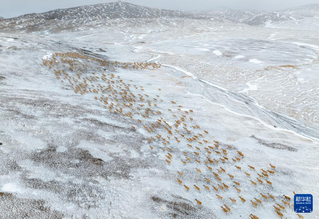 藏羚羊在向產(chǎn)羔地遷徙(無人機照片,5月10日攝)。新華社記者 姜帆 攝