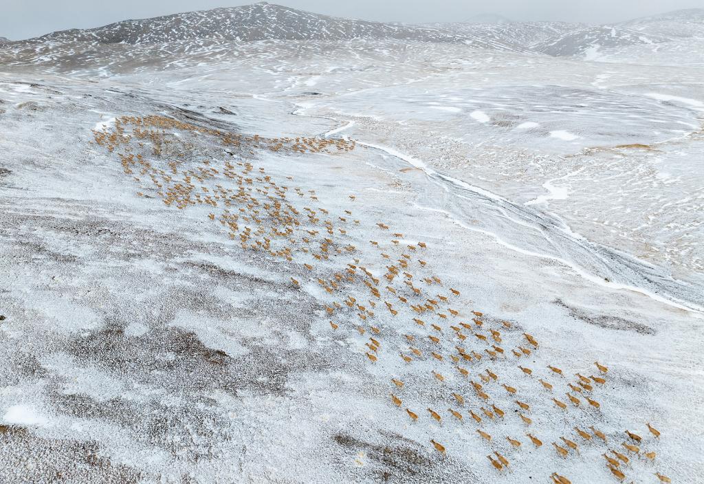 2024年5月10日,在羌塘國家級自然保護區(qū),大群懷孕的雌性藏羚羊開始集結(jié)成群,向產(chǎn)羔地遷徙。