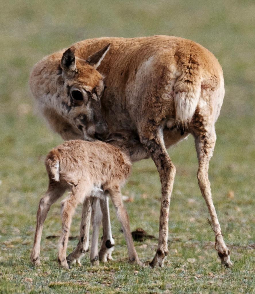 2024年6月17日,羌塘國家級自然保護區(qū)境內(nèi)的西藏那曲市申扎縣買巴鄉(xiāng)魯確塘草原上一只剛出生不久的小藏羚羊在吃奶。
