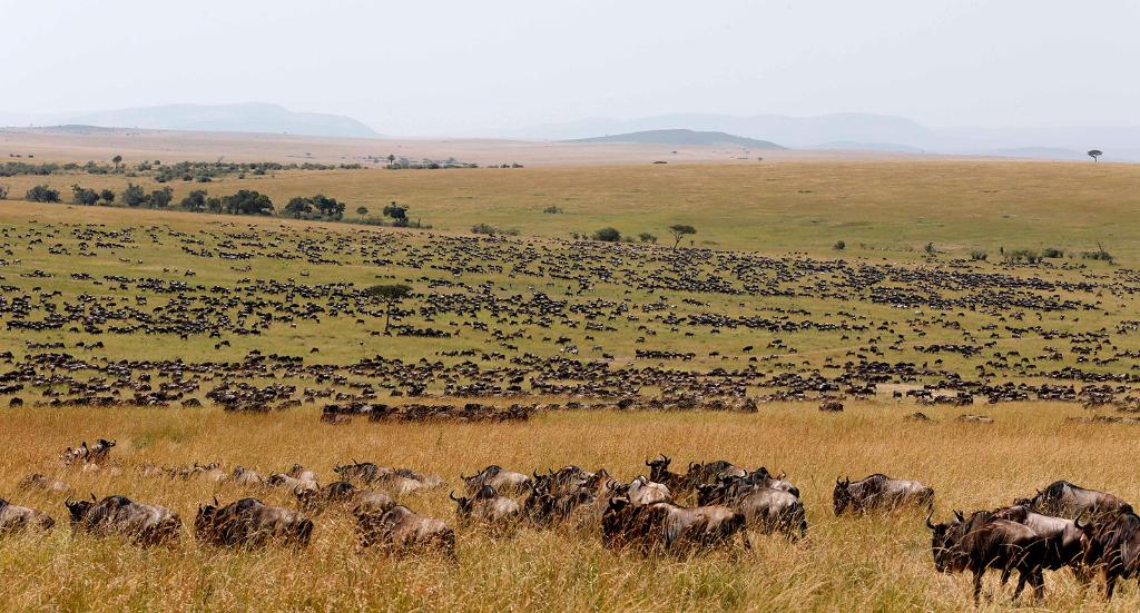 ↑ 在馬賽馬拉國家保護區(qū),遷徙中的野生動物在草原上覓食。