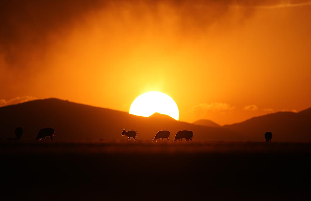 ↑ 在羌塘國家級自然保護區(qū),藏羚羊在夕陽下覓食。