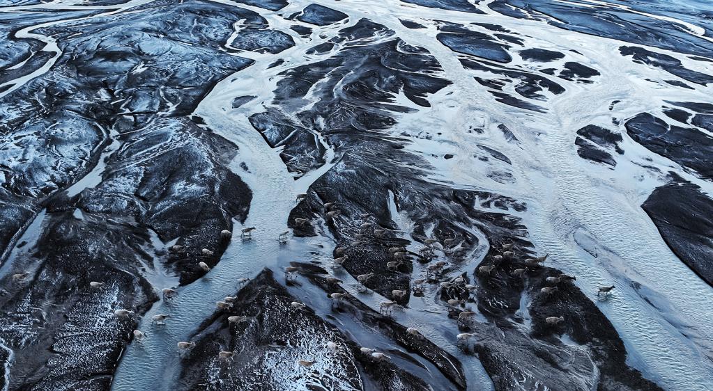 ↑ 在羌塘國家級自然保護區(qū),藏羚羊越過甜水河,前往“產(chǎn)房”。