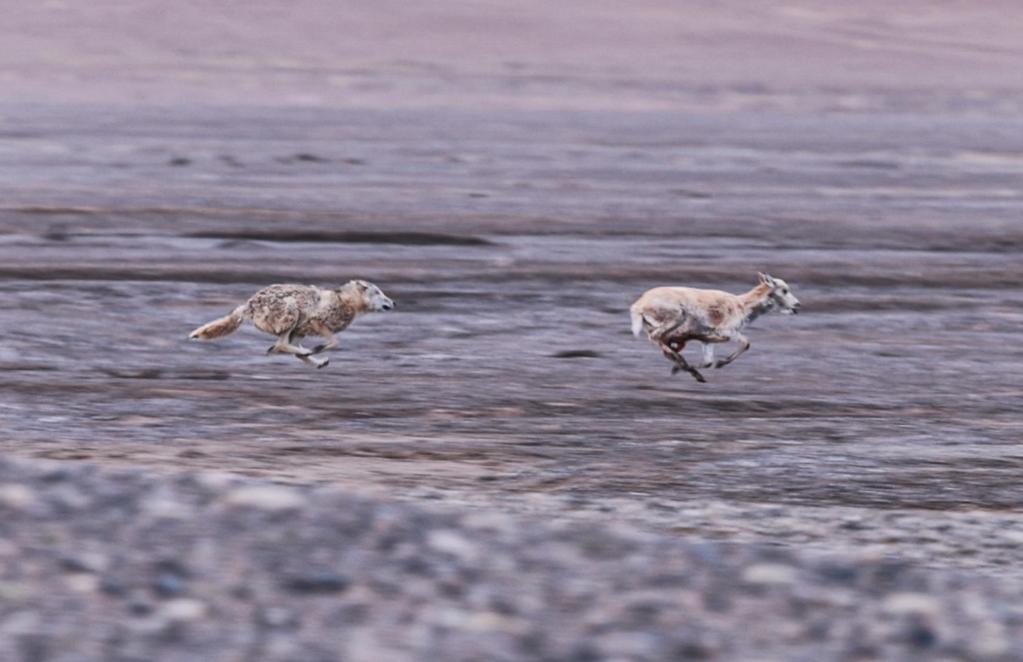 ↑ 在羌塘國家級自然保護區(qū),一只野狼正在捕食遷徙中的母藏羚羊。在藏羚羊的遷徙過程中,野狼、雪豹、藏馬熊和藏野狐等掠食動物守候在遷徙路上,隨時準備捕食。