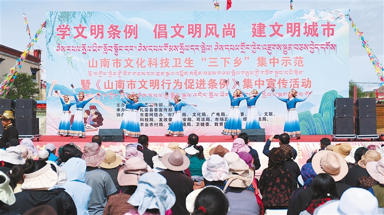近日,山南市委宣傳部、市文明辦聯(lián)合扎囊縣委宣傳部在扎囊縣阿扎鄉(xiāng)章達村,開展了以“學文明條例 倡文明風尚 建文明城市”為主題的山南市文化科技衛(wèi)生“三下鄉(xiāng)”集中示范暨《山南市文明行為促進條例》集中宣傳活動。 圖為活動現(xiàn)場。記者 汪純 攝