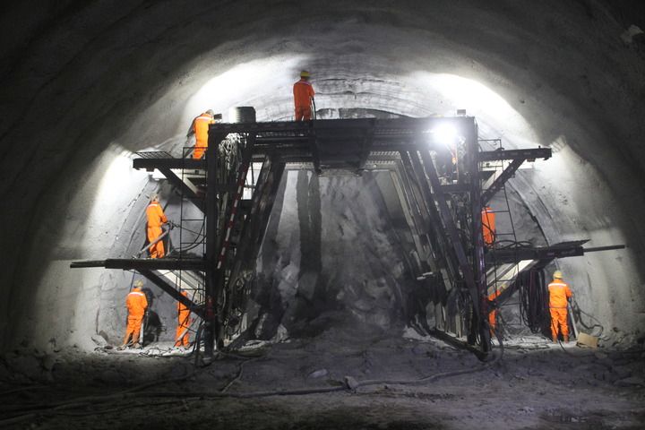 在拉薩至日喀則高等級(jí)公路帕當(dāng)山隧道,工人正進(jìn)行掌子面打眼作業(yè)。新華社發(fā)