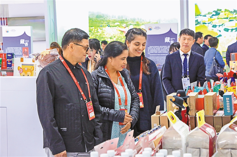 圖為尼泊爾聯(lián)邦院前主席、尼泊爾文化中心主席加內(nèi)什·普拉薩德·蒂米爾西納(左一)攜家人參觀特色綜合展區(qū)。記者 謝筱純 劉楓 胡文 攝
