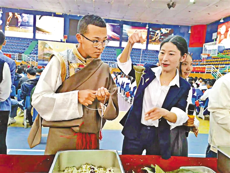 安徽援藏隊員手把手教山南二高學生包粽子。