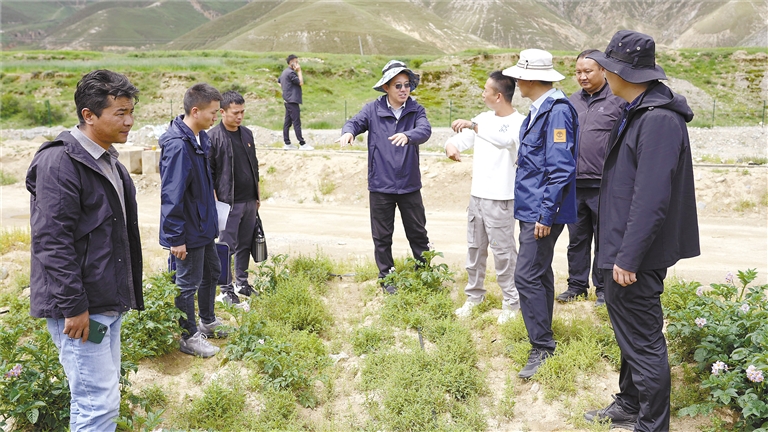南木林縣數(shù)字農(nóng)業(yè)產(chǎn)業(yè)園內(nèi),山東省第八批援藏干部調(diào)研“艾瑪”土豆種薯擴繁發(fā)展情況。