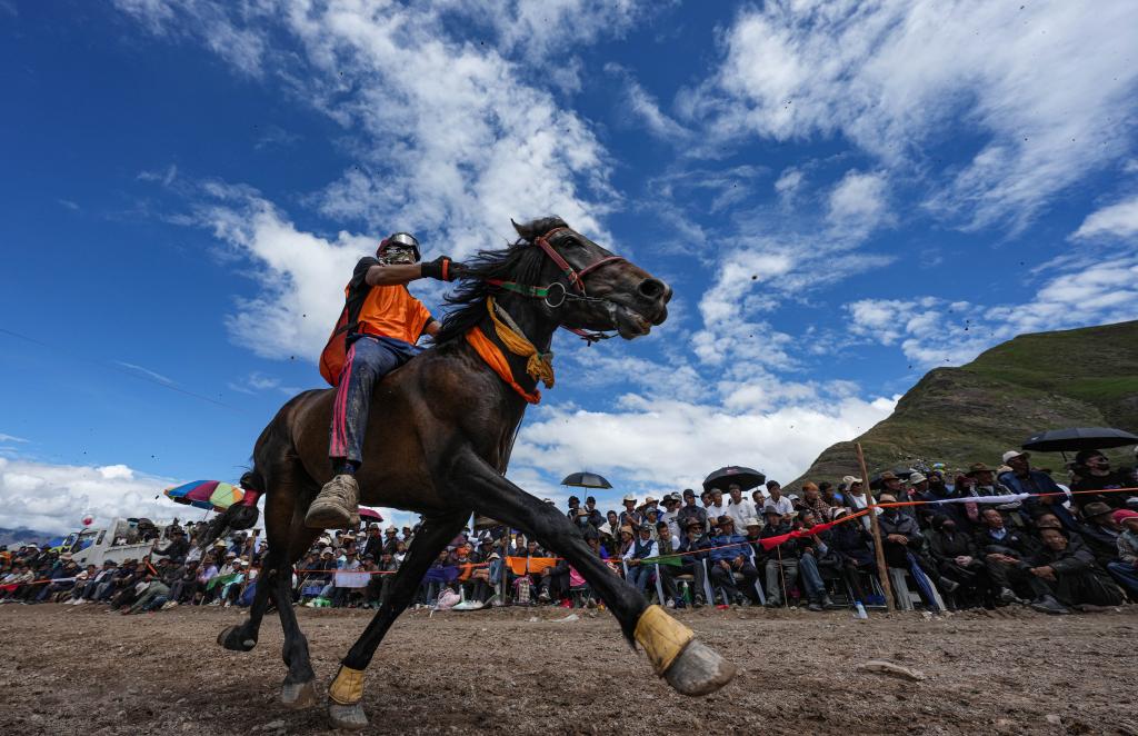 23日,在拉薩林周縣甘旦曲果鎮(zhèn)江角村的賽馬場(chǎng)上,選手邊瑪益丹穿著輕便的馬術(shù)運(yùn)動(dòng)服,上身貼緊棕色馬背,右手的馬鞭在空中打著旋,和他的愛(ài)馬進(jìn)行最后沖刺。