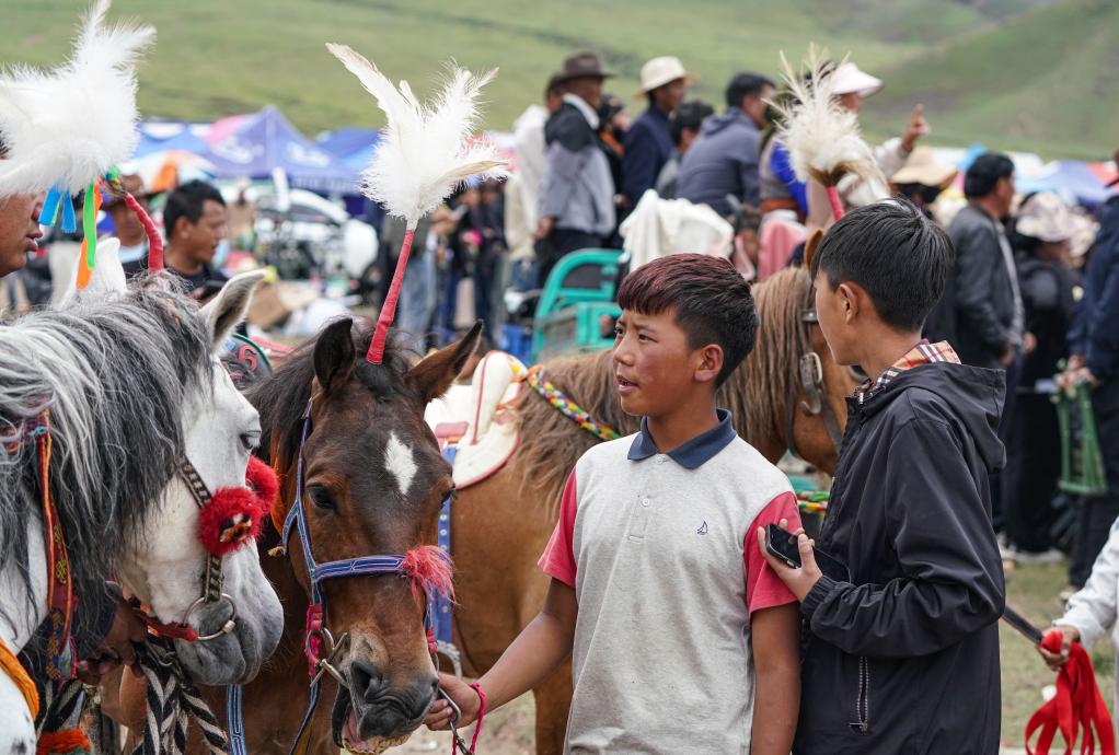 7月23日,一名小騎手欣賞對(duì)手的賽馬。新華社記者 晉美多吉 攝