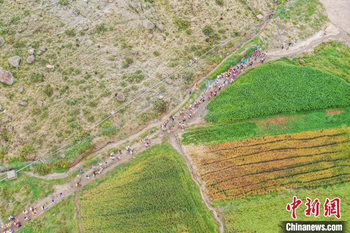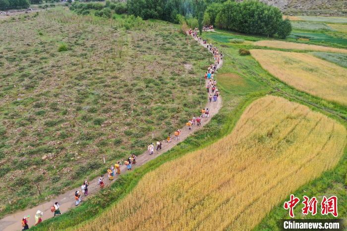7月24日,西藏拉薩市曲水縣南木村迎來了一年一度的“望果節(jié)”。當日,村民們盛裝打扮背上經文,圍繞全村田園轉上一圈,轉到每一塊農田前都要煨桑祈求風調雨順、五谷豐登。“望果節(jié)”民俗已有1500多年的歷史,是國家級非物質文化遺產。圖為曲水縣南木村村民身著盛裝背上經文繞田。(無人機照片)中新社記者 貢嘎來松 攝