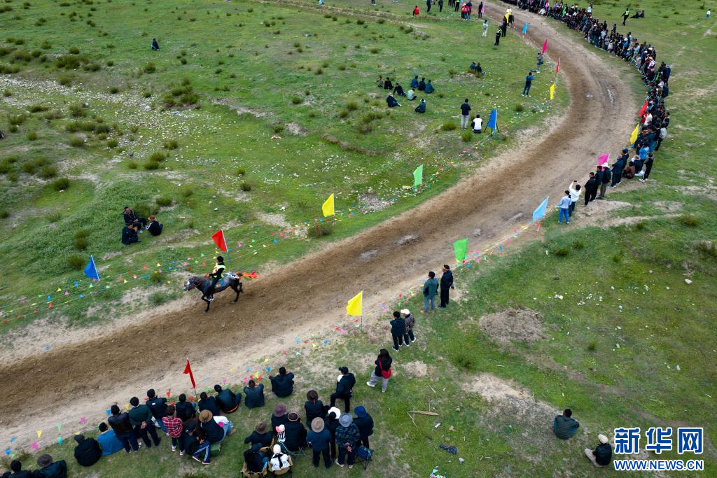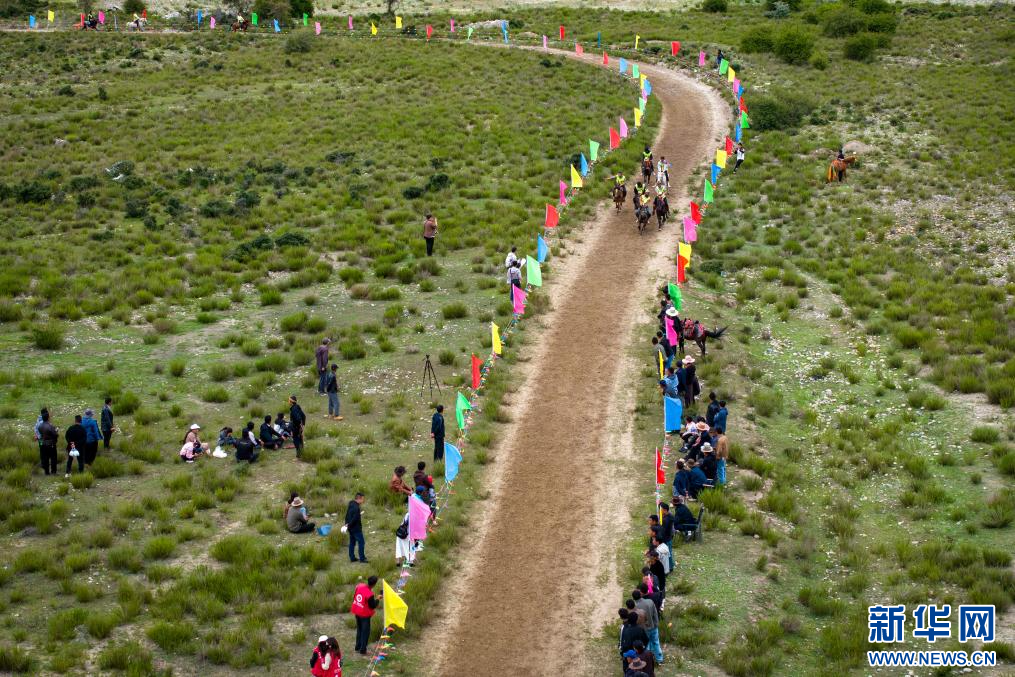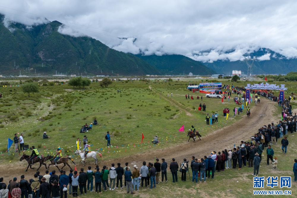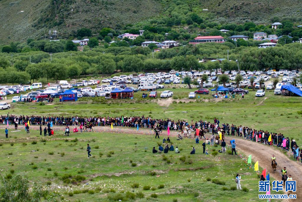 西藏林芝市林芝鎮(zhèn)第七屆尼洋旅游文化之民俗賽馬藝術(shù)節(jié)活動現(xiàn)場(7月22日攝,無人機(jī)照片)。新華網(wǎng) 旦增努布 攝