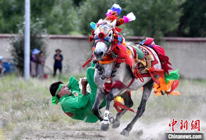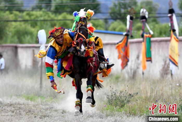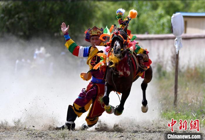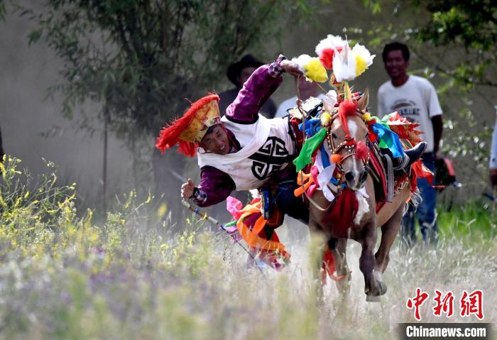 7月27日,西藏拉薩市桑達(dá)村迎來(lái)“望果節(jié)”,村民們舉行賽馬活動(dòng)慶祝?!巴?jié)”是西藏傳統(tǒng)的豐收節(jié),具體日期隨各地莊稼成熟的時(shí)間而變化。“望果節(jié)”期間,按照習(xí)俗,各地都會(huì)舉辦賽馬比賽。圖為騎手進(jìn)行馬術(shù)表演。中新社記者 李林 攝