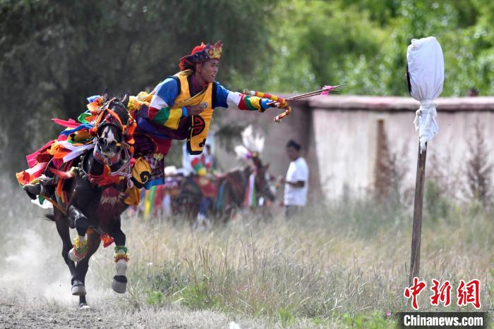 7月27日,西藏拉薩市桑達(dá)村迎來(lái)“望果節(jié)”,村民們舉行賽馬活動(dòng)慶祝。“望果節(jié)”是西藏傳統(tǒng)的豐收節(jié),具體日期隨各地莊稼成熟的時(shí)間而變化?!巴?jié)”期間,按照習(xí)俗,各地都會(huì)舉辦賽馬比賽。圖為騎手進(jìn)行馬上射箭表演。中新社記者 李林 攝