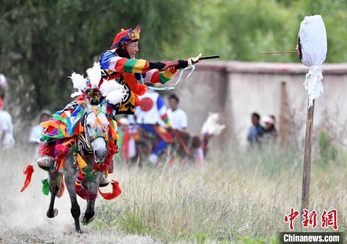 7月27日,西藏拉薩市桑達(dá)村迎來(lái)“望果節(jié)”,村民們舉行賽馬活動(dòng)慶祝?!巴?jié)”是西藏傳統(tǒng)的豐收節(jié),具體日期隨各地莊稼成熟的時(shí)間而變化?!巴?jié)”期間,按照習(xí)俗,各地都會(huì)舉辦賽馬比賽。圖為騎手進(jìn)行馬上射擊表演。中新社記者 李林 攝